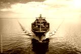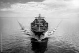 Aerial front view of a loaded container cargo vessel traveling over calm ocean