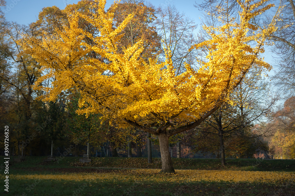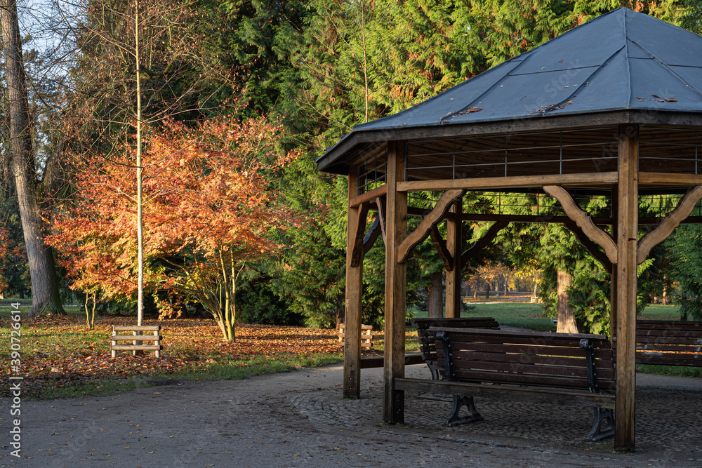 Gazebo and benches in a public park Stromovka in Prague, Czech Republic in autumn