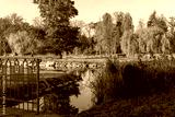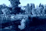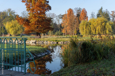 Scenic view of Stromovka town park in Prague, Czech Republic. Colorful autumnal leaves on trees, footpath and a pond. Calm early morning scenery