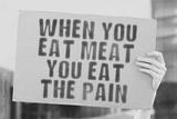 The phrase " When you eat meat you eat the pain " on a banner in hand. Human holds a cardboard with an inscription. Cruelty. Animal rights. Illegal. Painful. Protest. Strike. Nutrition