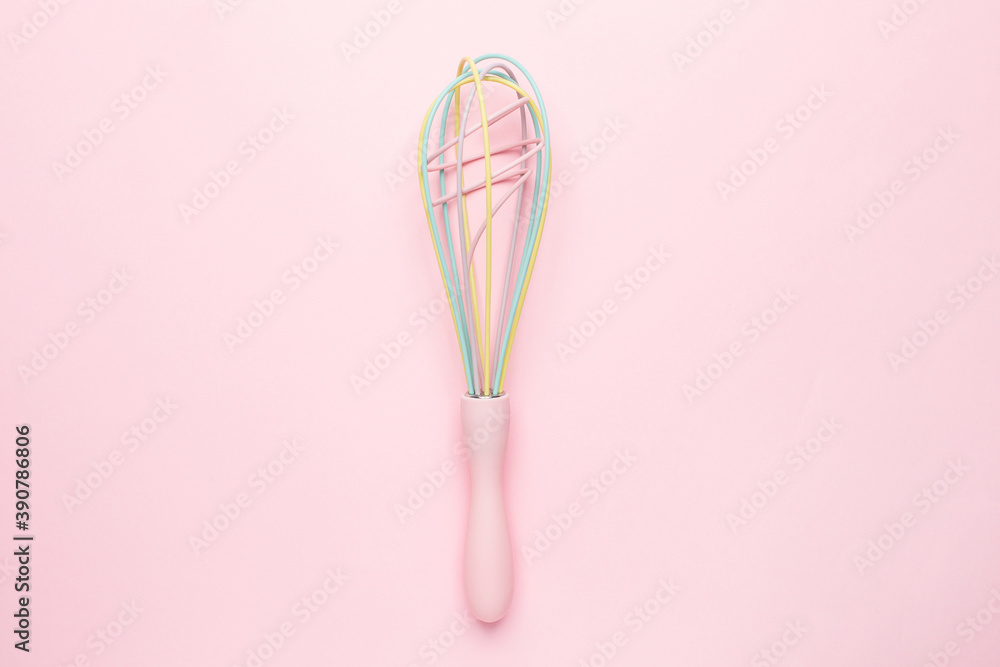 Multi-colored pastel kitchen whisk on pink background, cute kitchen utensils, feminine cooking