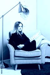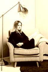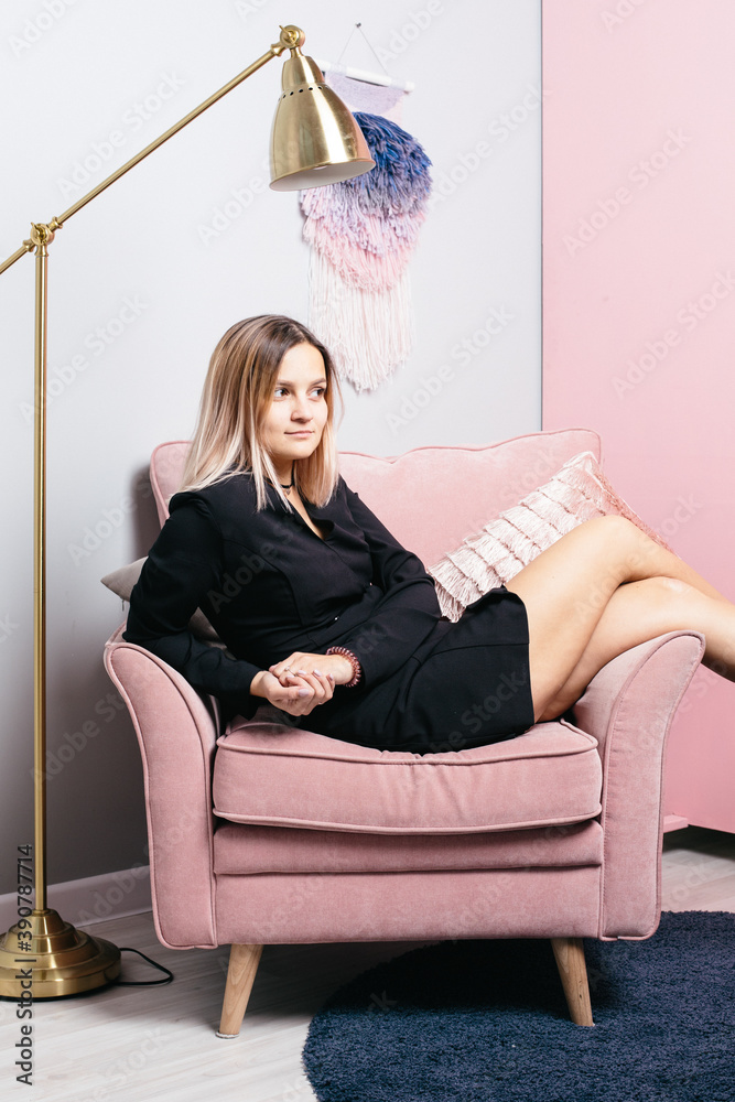Mysterious thoughtful woman in black dress on pink chair vertical view