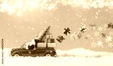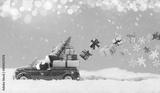 Santa Claus in Red car delivering christmas or New Year gifts at snowy background.