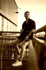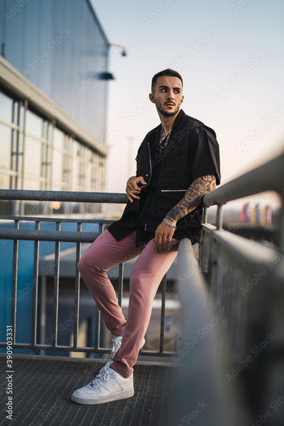 Young hot man wearing a black oversize shirt and pink pants leaning on the handrails