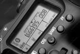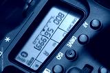 The LCD screen with information on top of the camera. The data display on the digital camera, close up.