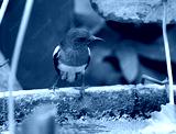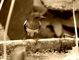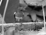 Thai bird at garden. Oriental Magpie Robin - Copsychus saularis standing over water pool, Thailand.