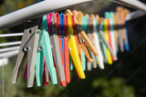 A colored clothes pegs hanging on a drying rack wire. A group of clothespin in line on stand at the sunny garden.