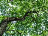 big tree branch and leaves a nature green leaf background of monkey pod tree shrub from bottom view angle or beautiful shady scene in the park