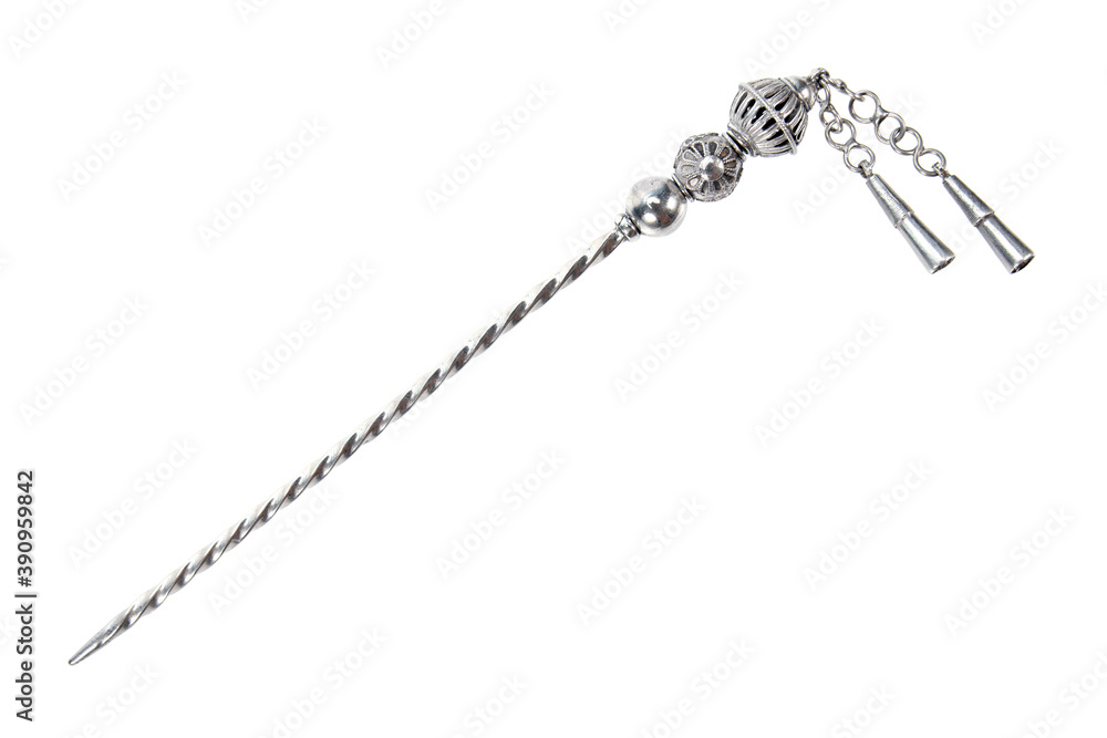 Silver hairpin isolated on white background. Silver twist hair pin decoration with flower design pattern and chains isolated