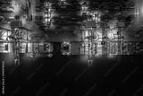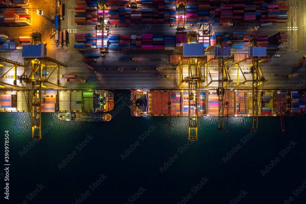 Container ship loading and unloading in deep sea port, Aerial view at night