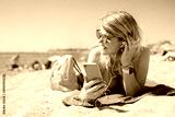Woman listening to music while relaxing on the beach in hot summer day