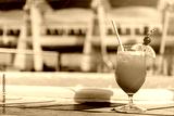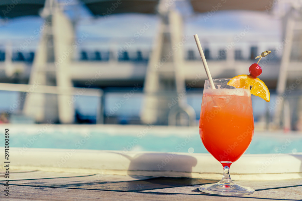 orange cocktail glasses on rattan bench at wooden cruise deck summer vacation moment relax and peaceful concept