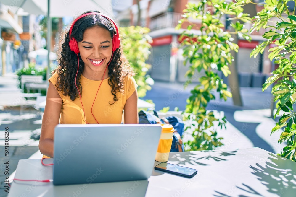 Young african american student girl using laptop sitting on the table at terrace.