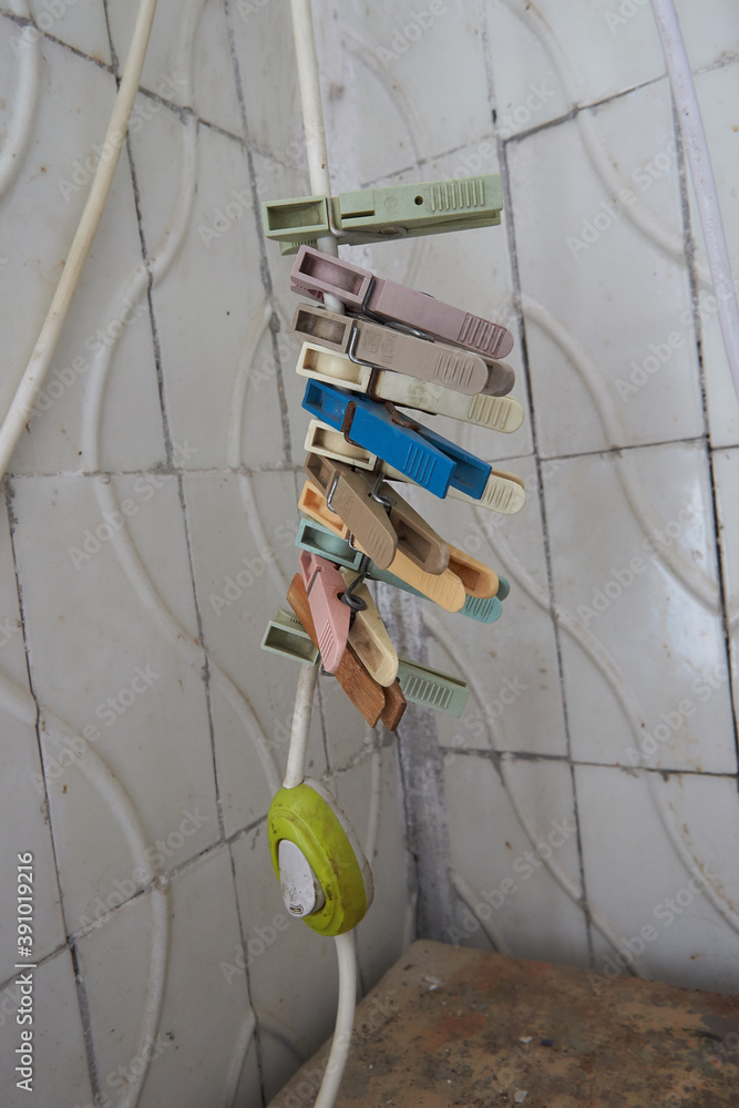 dirty clothespins on the rope. Plastic clothespins in different colors.