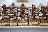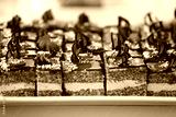 Delicious chocolate cake on table decorated for special event. Catering sweets