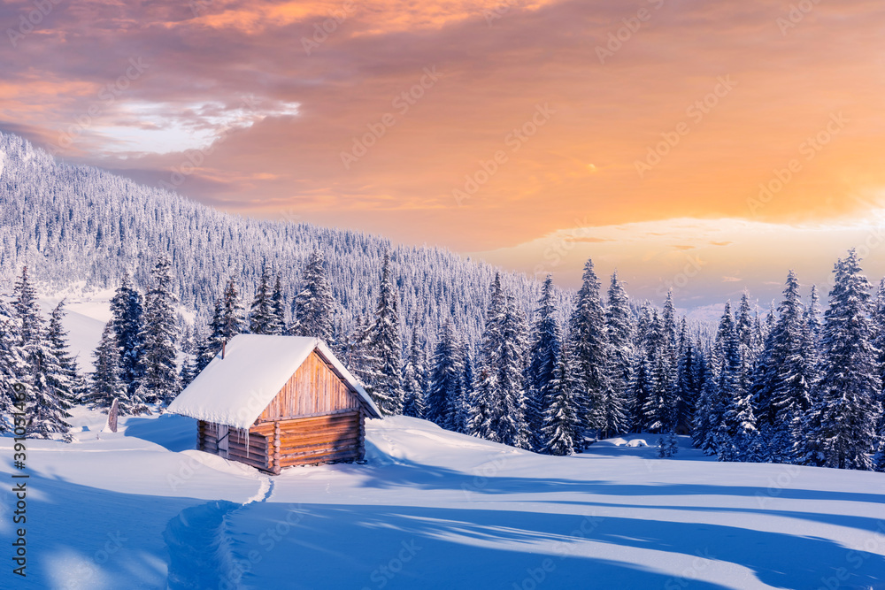 Fantastic winter landscape with wooden house in snowy mountains. Christmas holiday concept. Carpathians mountain, Ukraine, Europe