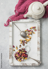 Rose buds mix tea in wooden box with tea vintage strainer infuser and teapot on white background with red cloth