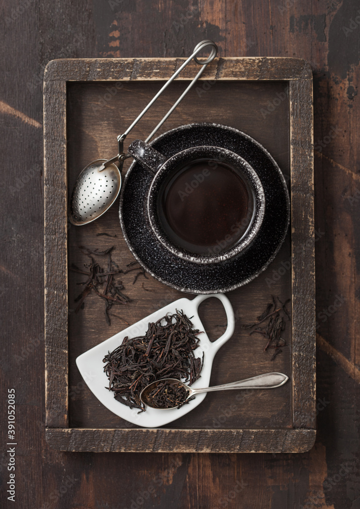 Loose black tea on cup shape ceramic plate with vintage strainer infuser in wooden box with black ceramic cup
