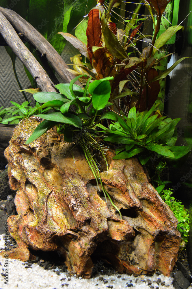 Beautiful aquatic decor in an aquarium, with aquatic plants. This is aquascaping