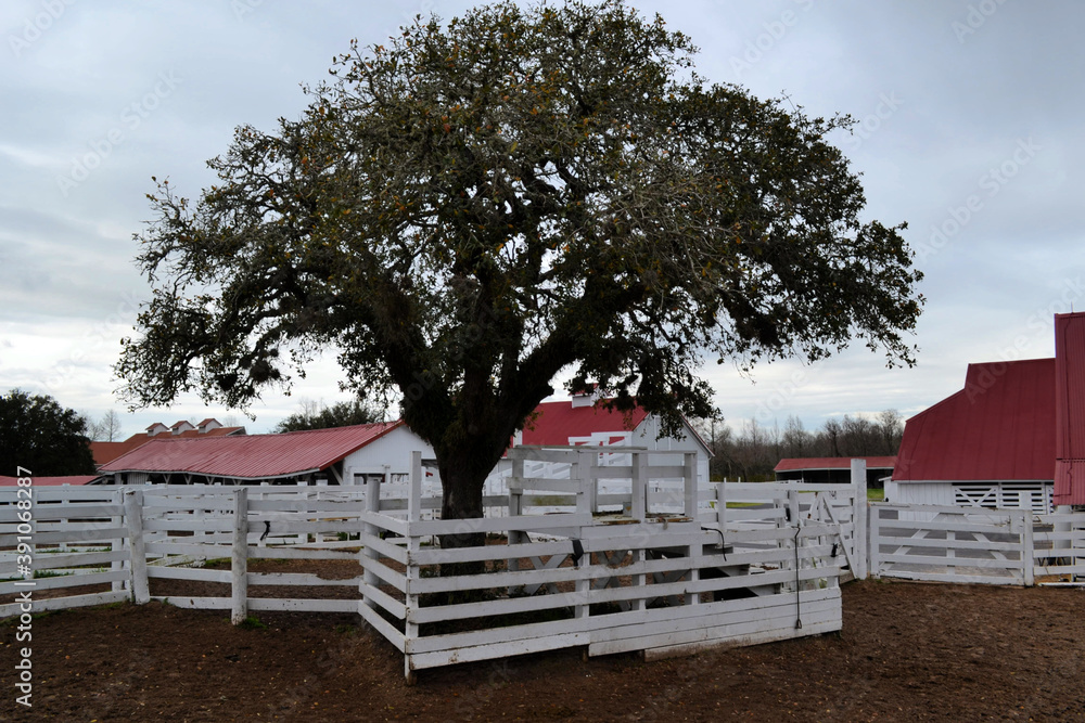 Typical Texan farm with white fence and a tree, Richmond, Texas