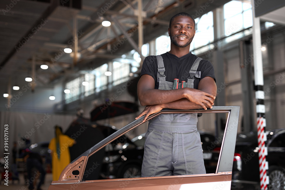 portrait of positive afro american auto mechanic in uniform posing after work, he is keen on repairing cars, automobiles.
