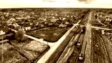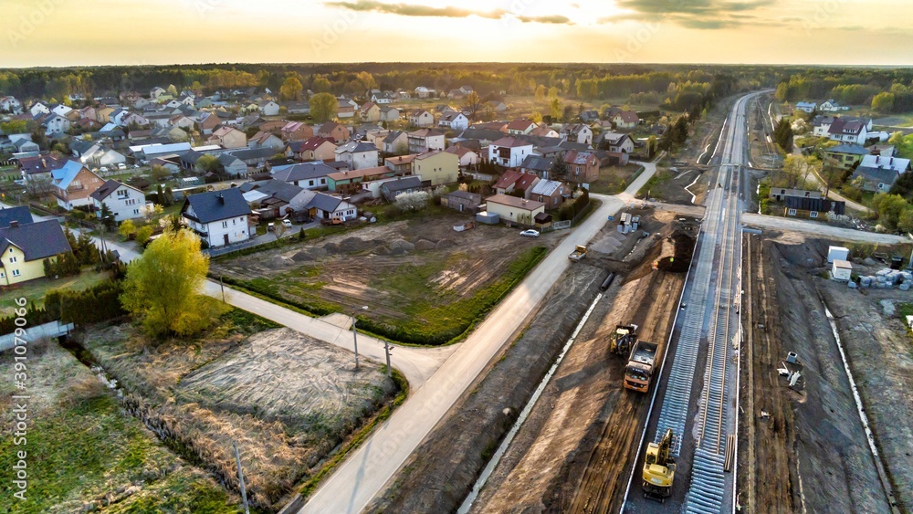Aerial view on small village located in central Poland. Summer landscape, cloudy afternoon. Green meadows, calm light. Railroad under construction.