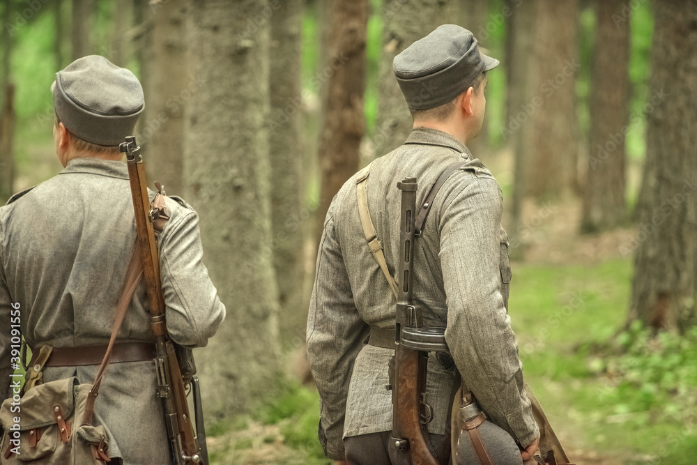 Finnish soldiers of the second world war in the forest with machine guns and rifles on their shoulders