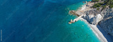 Aerial drone ultra wide panoramic photo of famous beach for stone rocky arch formation of Lalaria, Skiathos island, Sporades, Greece