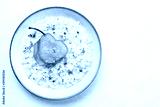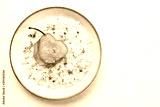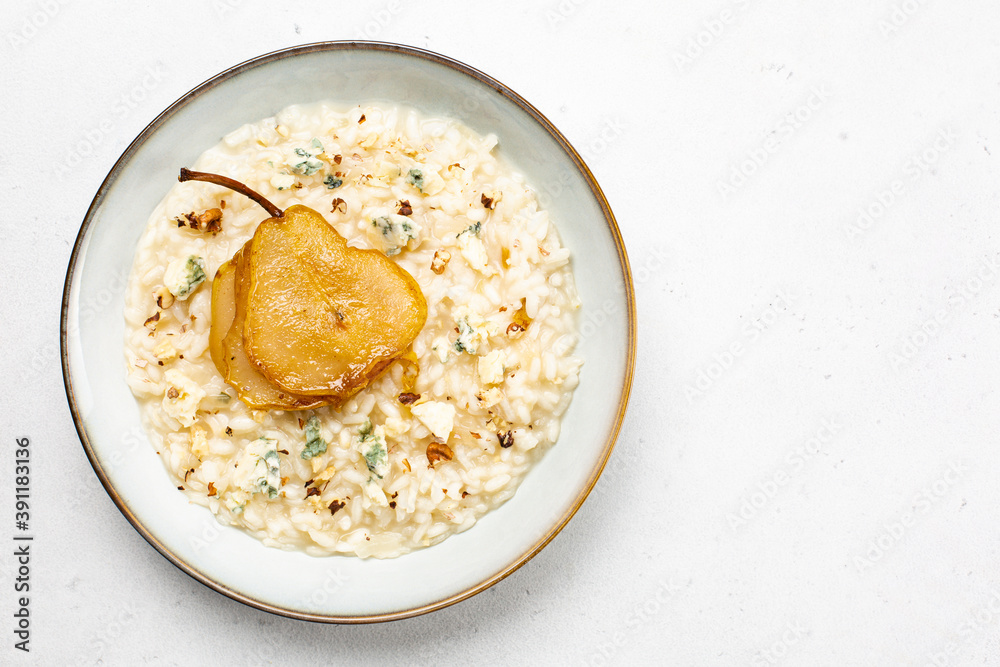 Italian risotto with blue cheese, pear and walnuts on white table. Copy space.