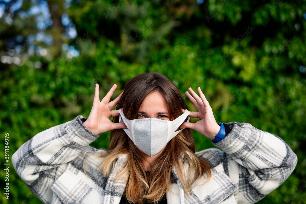 Portrait of young woman putting on protective mask outdoors