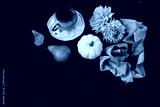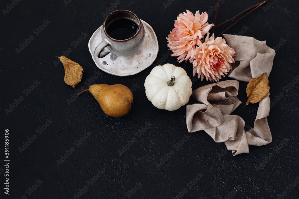 Autumn still life composition. Cup of coffee, pear fruit and white pumpkins with pink dahlia flowers. Black table background. Beech leaves. Moody fall, Thanksgiving design. Flat lay, top view.