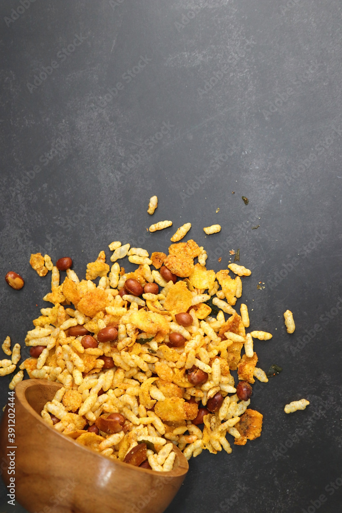 Murmura cornflakes Chivda or Chiwada. Diwali special savory snack mixture, made out of puffed rice, fried peanuts, curry leaves, and some spices. Traditional Indian Diwali Snacks. with Copy Space.