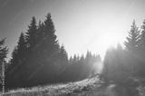 Forest in Izera Mountains at sunrise, color toning applied, Poland.