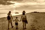 Two women hold the hands of a son. Family holidays on the sea coast.