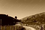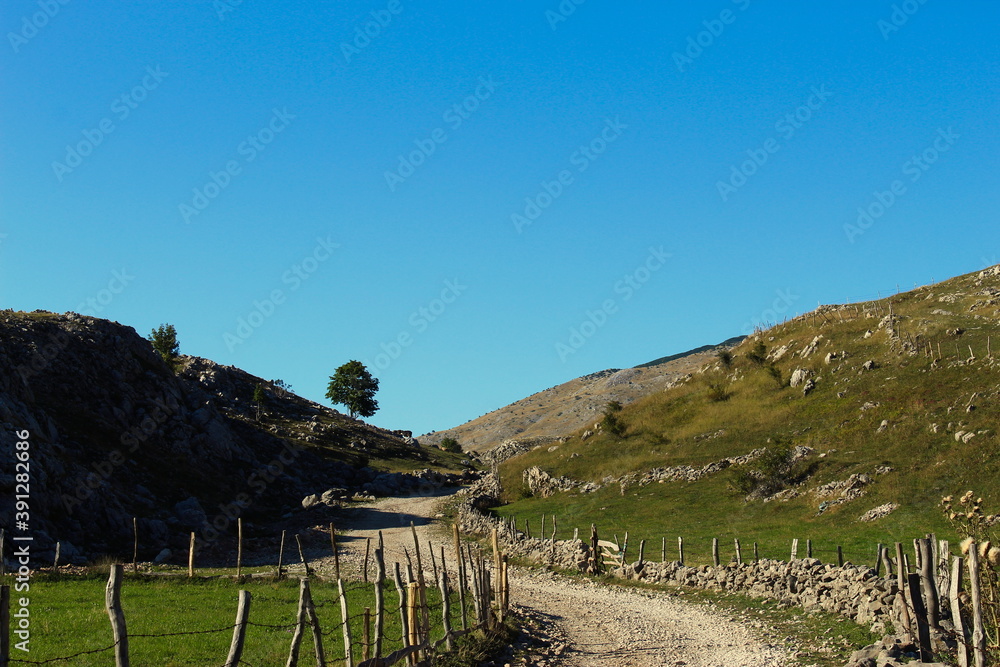 Mountain road that leads to the old Bosnian village of Lukomir. Autumn on the mountain. The road is surrounded by stone with wooden pillars connected by barbed wire.