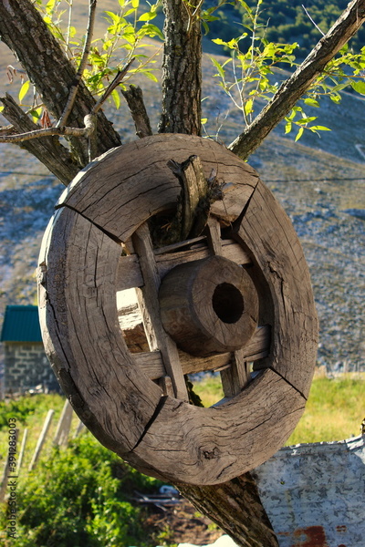 A wooden wheel hung on a tree in the old Bosnian village of Lukomir.