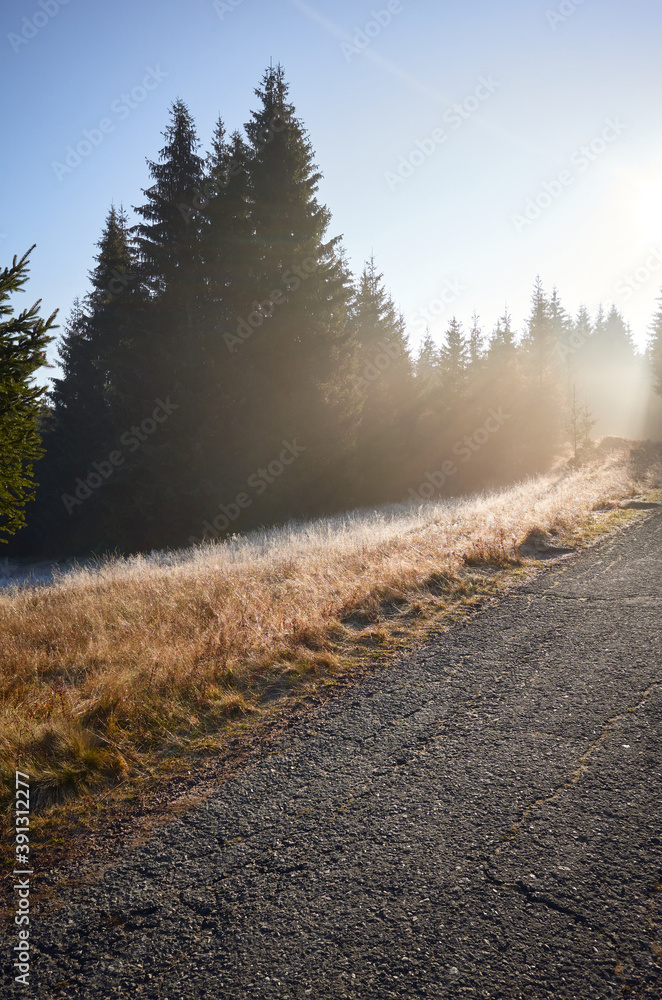 Road in Izera Mountains forest at sunrise, Poland.