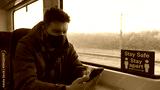 male passenger wearing face covering mask during covid-19 lockdown using phone inside train in england uk