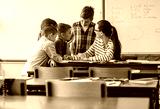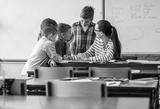 Female teacher helps school kids to finish they lesson.They sitting all together at one desk.