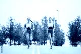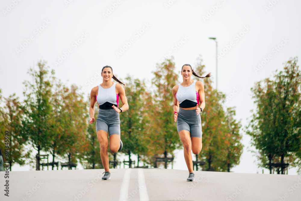 Two beautiful twin sisters running around the city in sportswear.