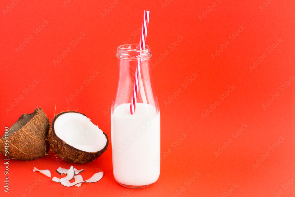 Coconut milk in the glass bottle on the red background with copy space