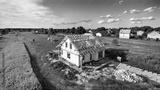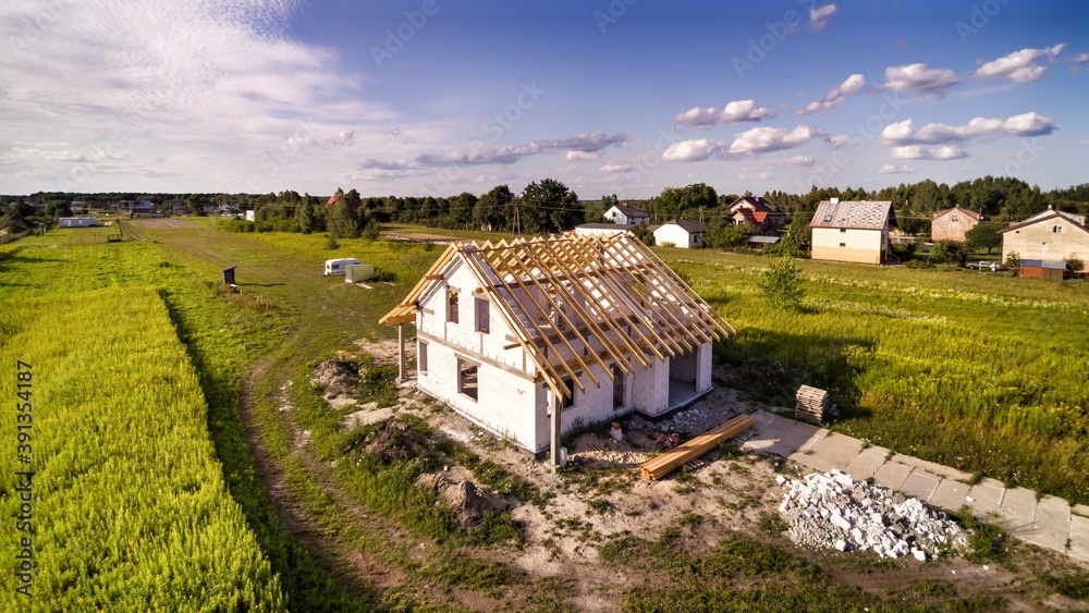 Aerial view on detached house under construction. House in basic state. Wooden roof structure under construction. House located on green plot in small village. Green meadows around.