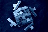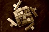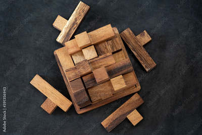 Wooden block brain teaser on dark background. Pieces Close Up. Top view