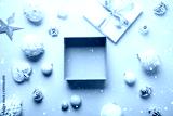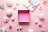 Merry Christmas and Happy Holidays greeting card, frame, banner. New Year. Noel. Christmas white silver ornaments and empty gift box on pink background top view. Winter xmas holiday theme. Flat lay