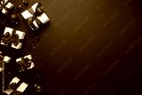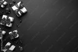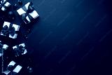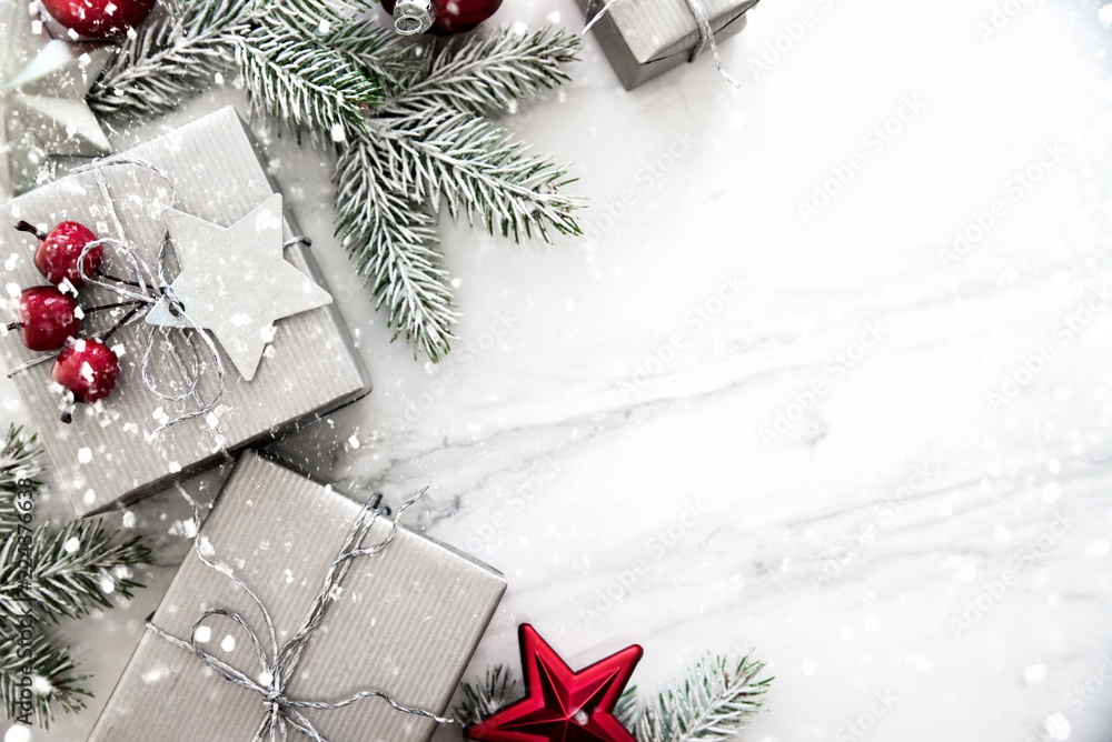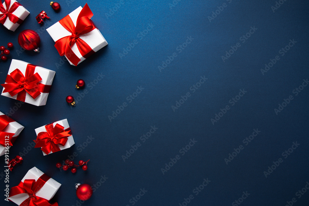 Merry Christmas and Happy Holidays greeting card, frame, banner. New Year. Noel. Christmas ornaments and gift box on blue background top view. Winter xmas holiday theme. Flat lay