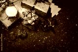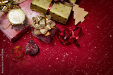 Christmas and New Year composition. Greeting card with gifts, ribbons, toys on the Christmas tree and bows on a red background.