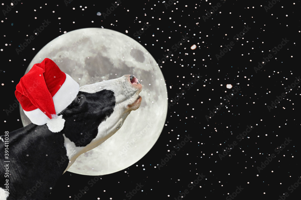 Funny cow in Christmas Santa hat on the background of large bright moon