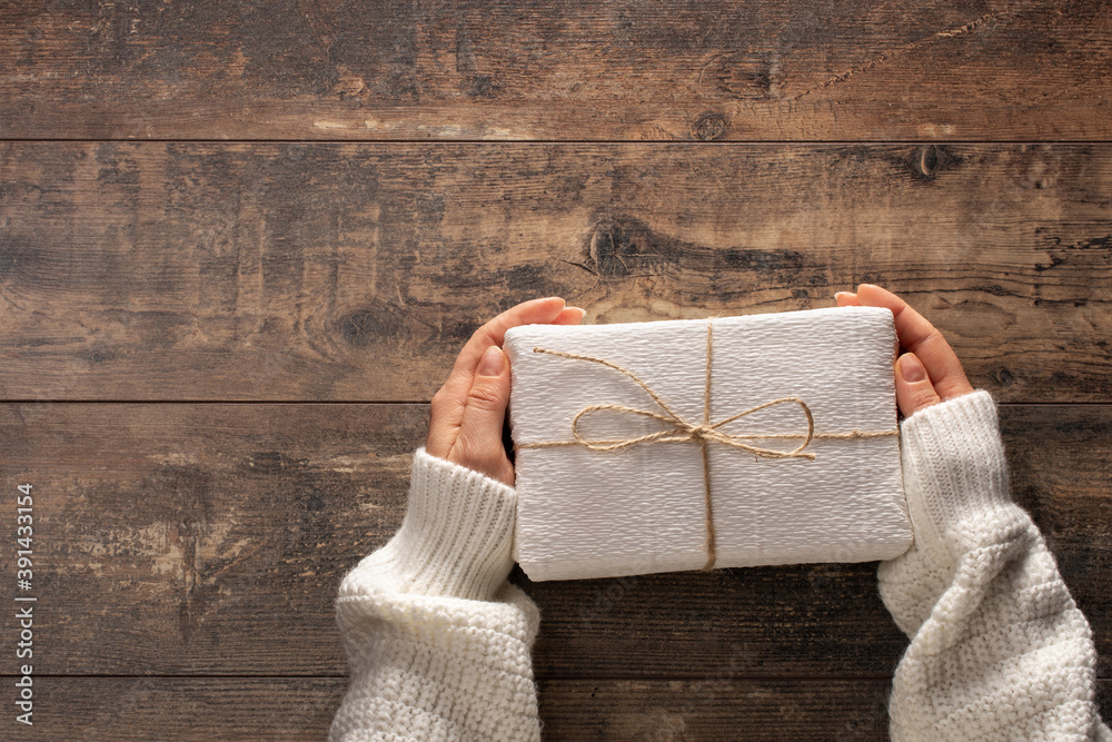 woman holding christmas gift box. Wooden rustic table. Top view woman hands holding present box