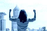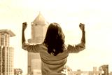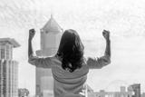 Woman power and girl strength in business achievement, winning and career success with strong businesswoman leader in office raising fists with ambition looking forward to city building background