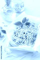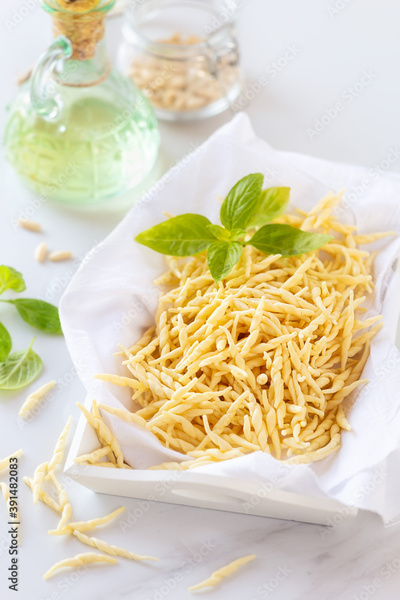 Fresh homemade short twisted pasta Trofie - typical of Liguria Region in Italy - with basil, olive oil and pine nuts at the background